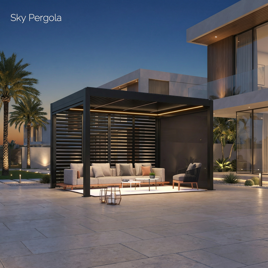 Beste Preis-Leistung SkyMotion LED Pergola ab CHF 5,390.00 Motorisiertes Dach integriert LED Rahmen und Lamellen Mehr erfahren →