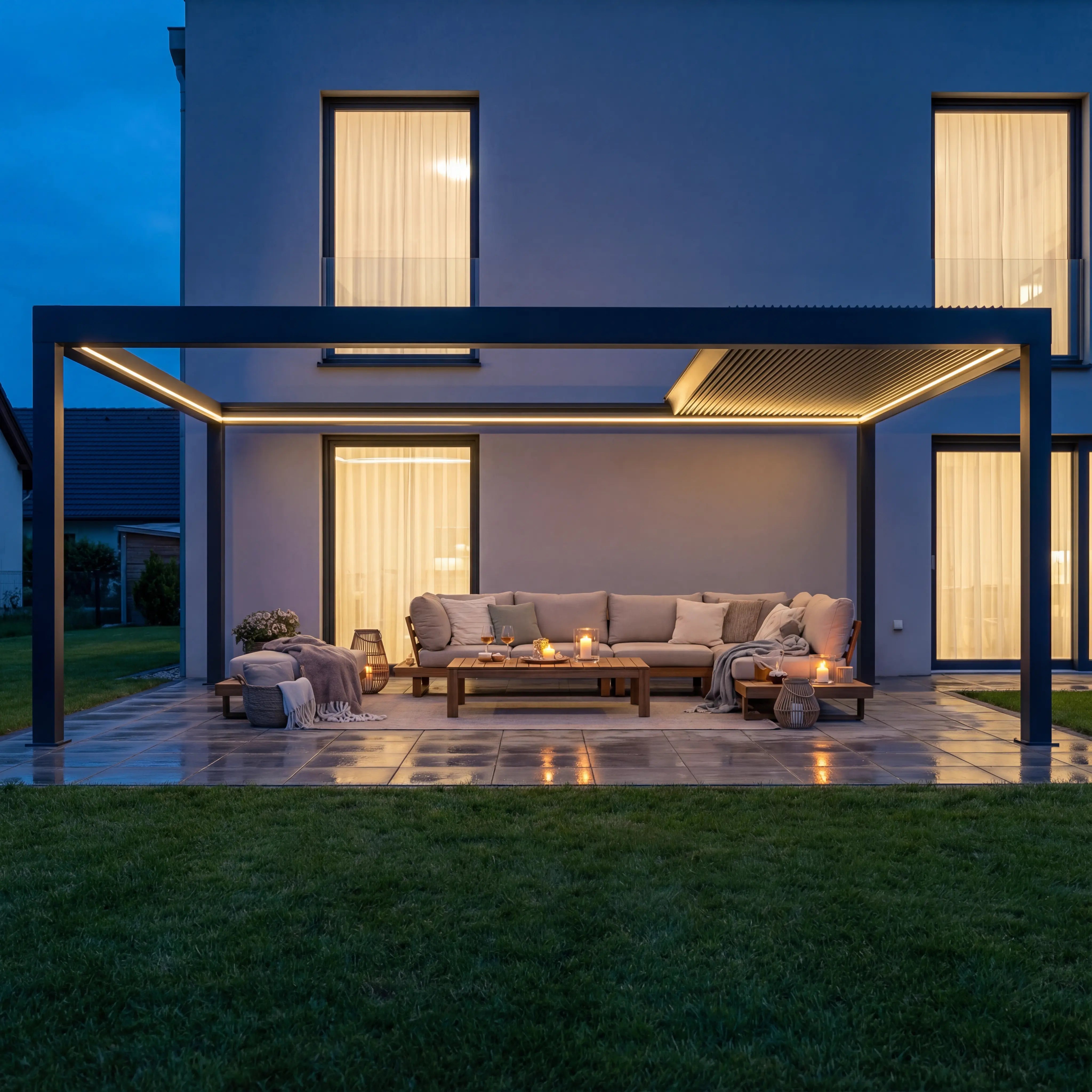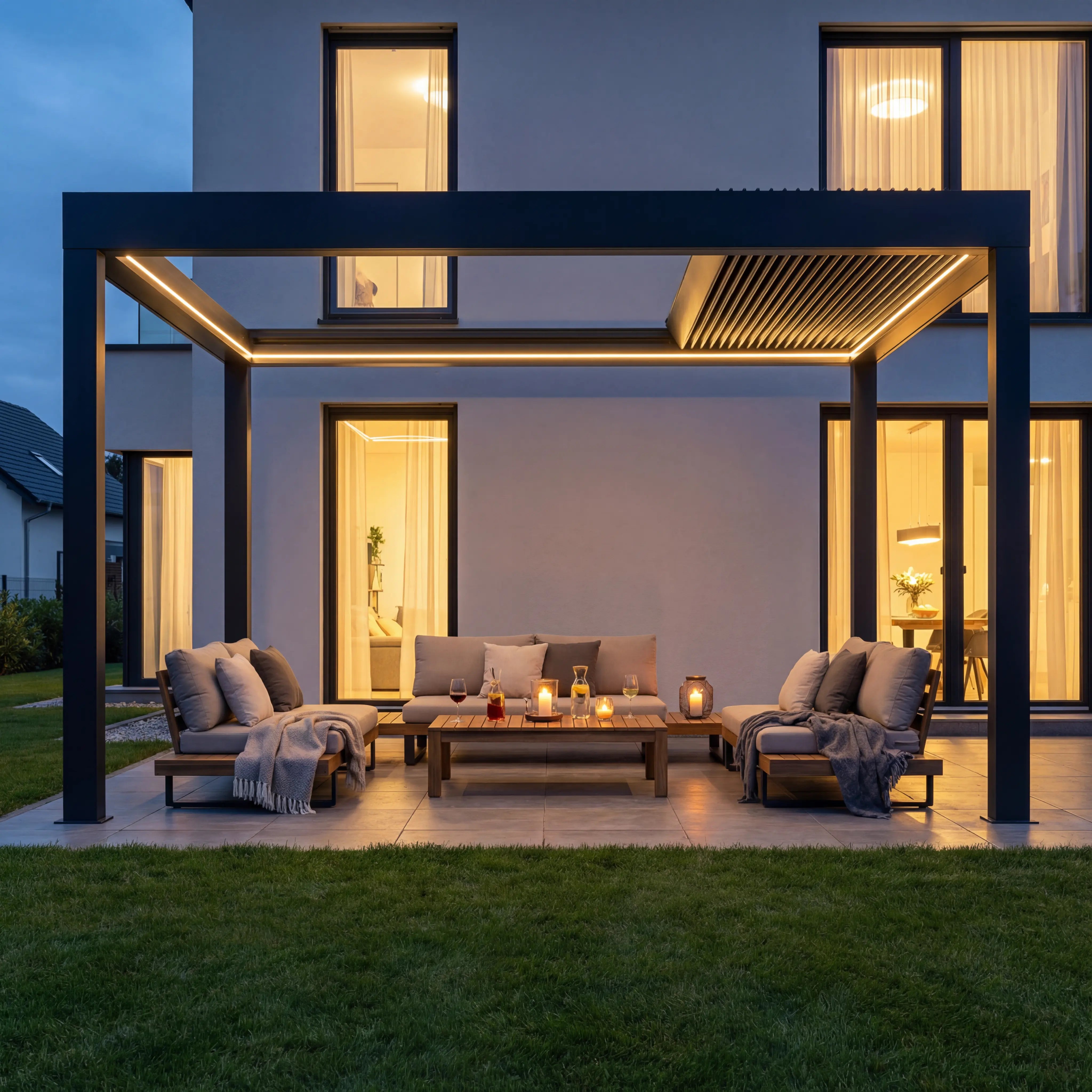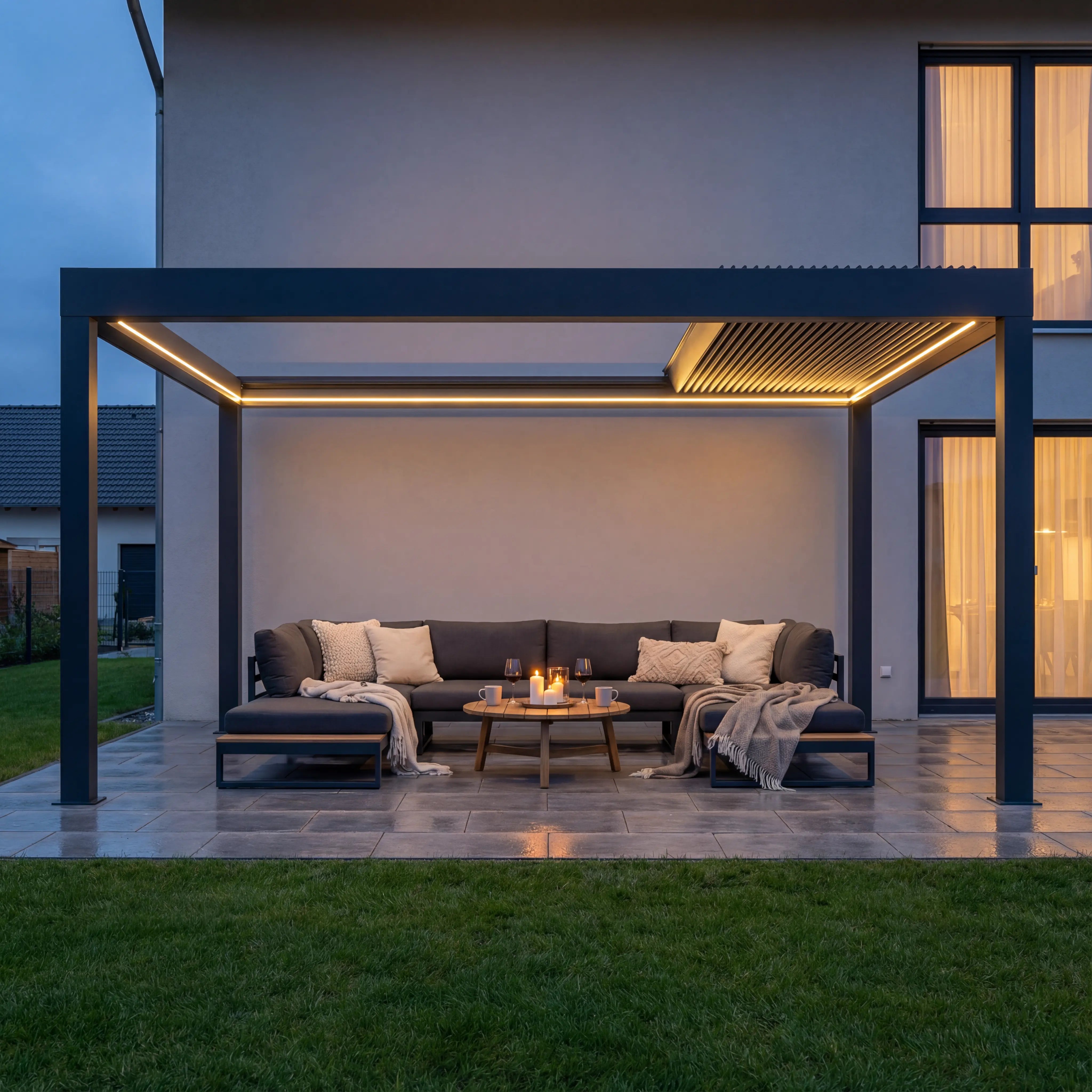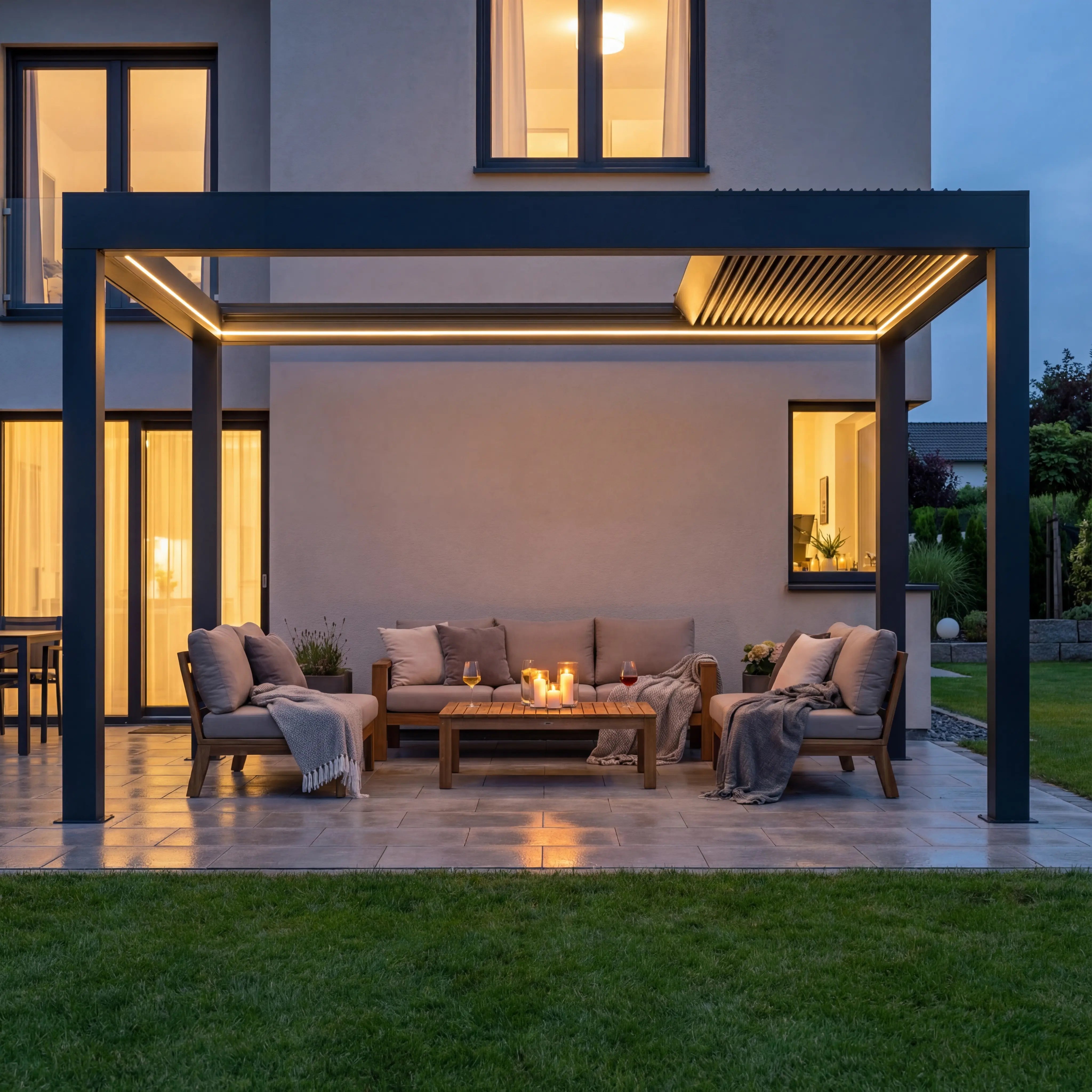 Unsere Pergola ist mit einer eleganten LED-Beleuchtung ausgestattet. Im Rahmen befindet sich eine dimmbare warmweiße LED-Lichtleiste, die eine stilvolle und angenehme Atmosphäre schafft. Die Beleuchtung ist wetterfest, energieeffizient und kann bequem per App, Sprachsteuerung oder Fernbedienung gesteuert werden.