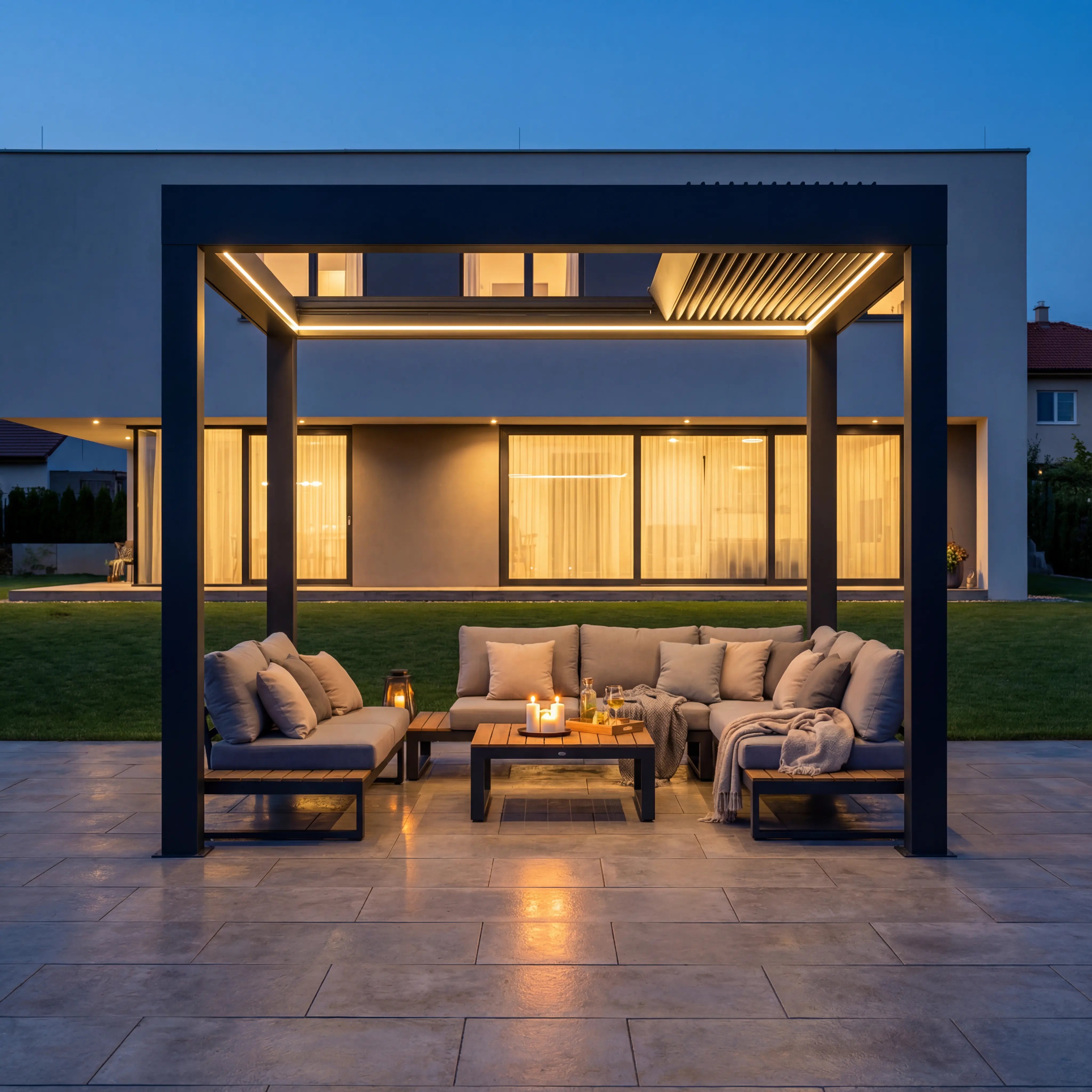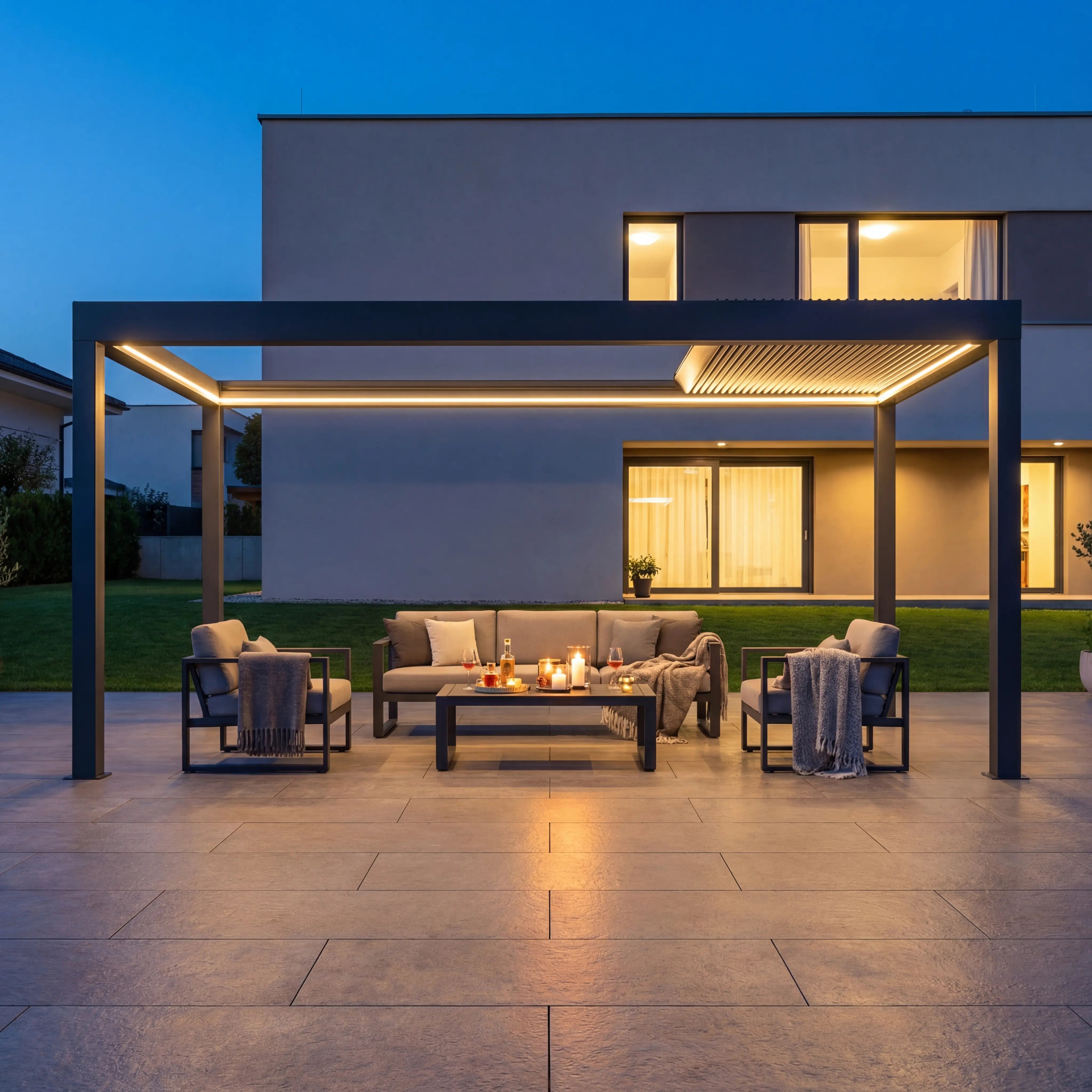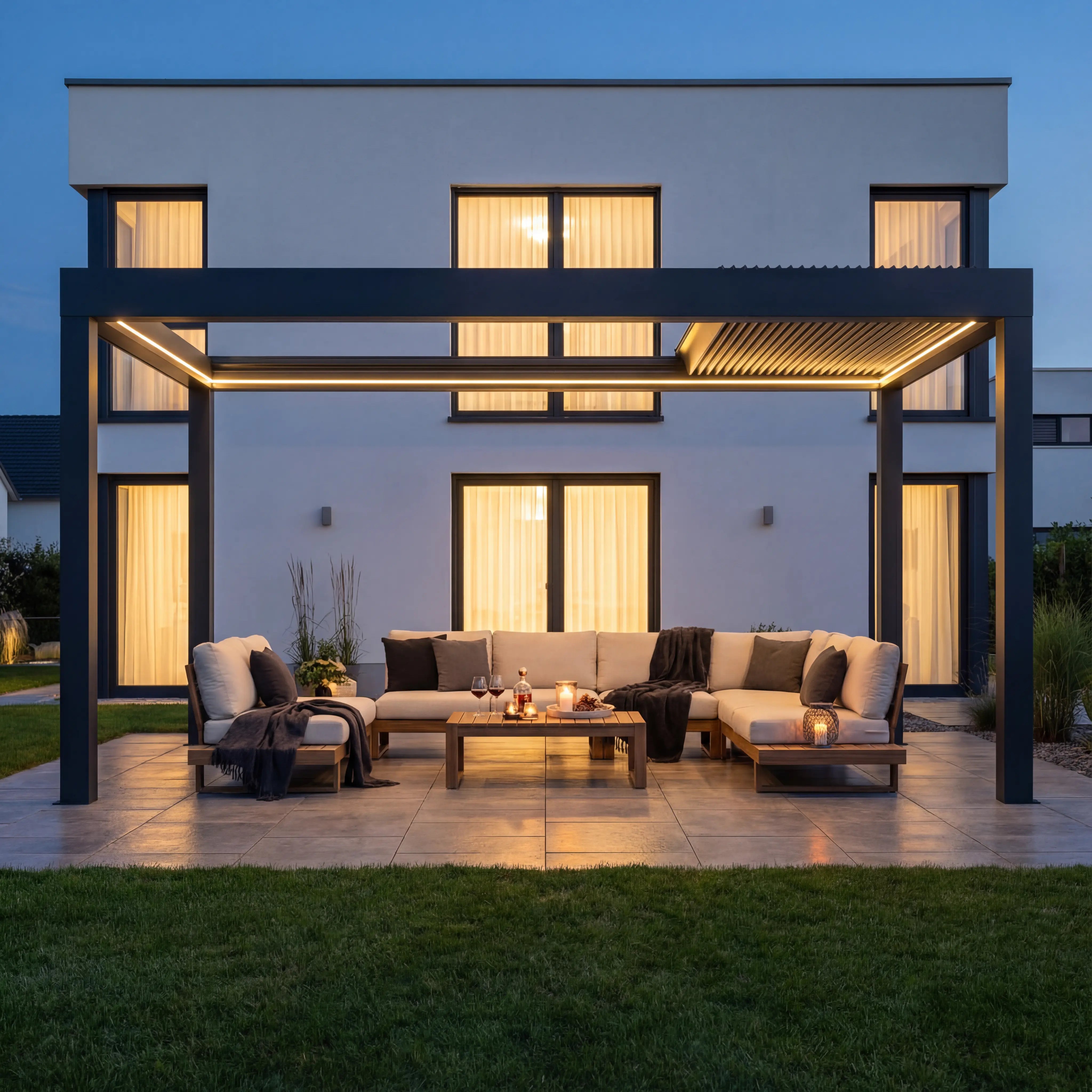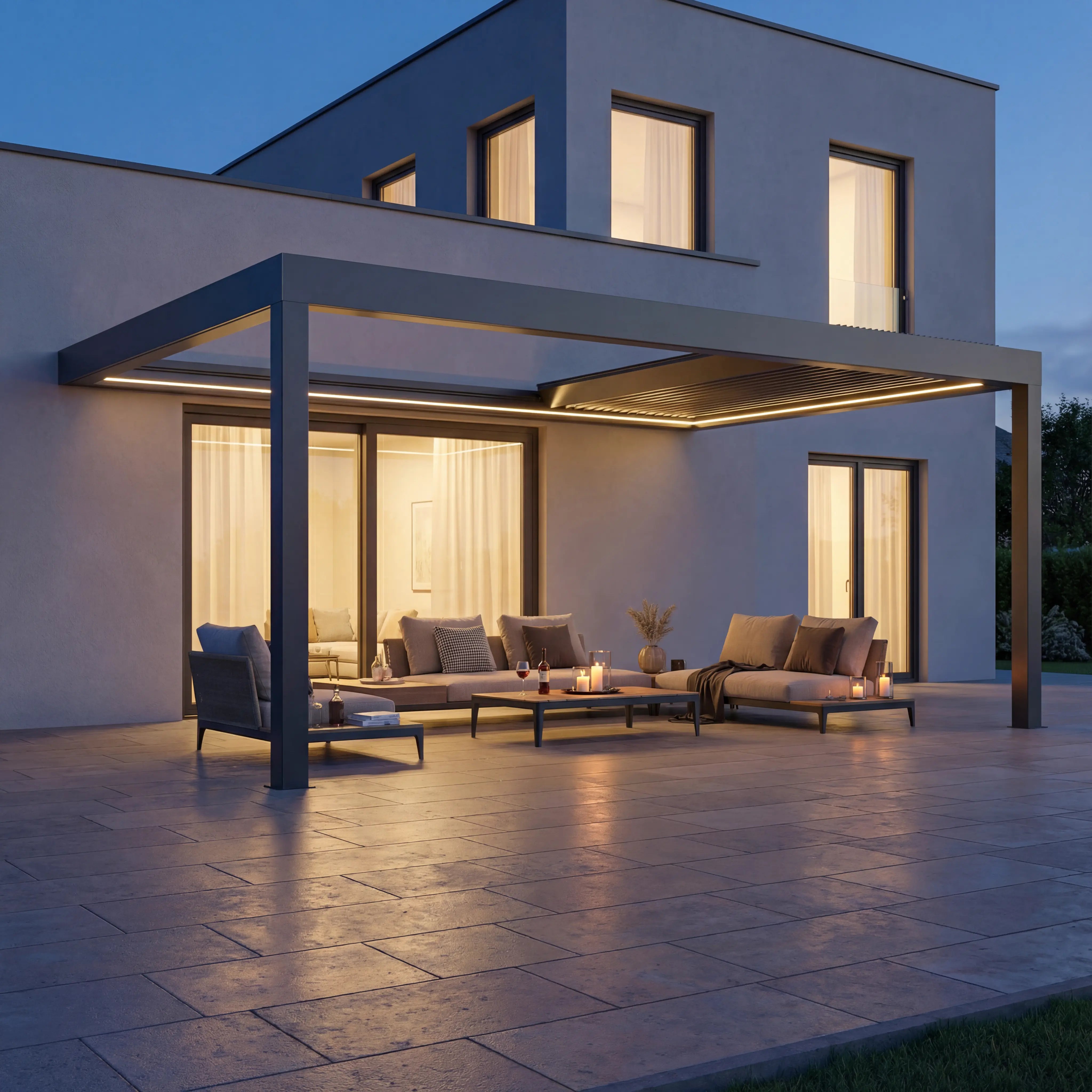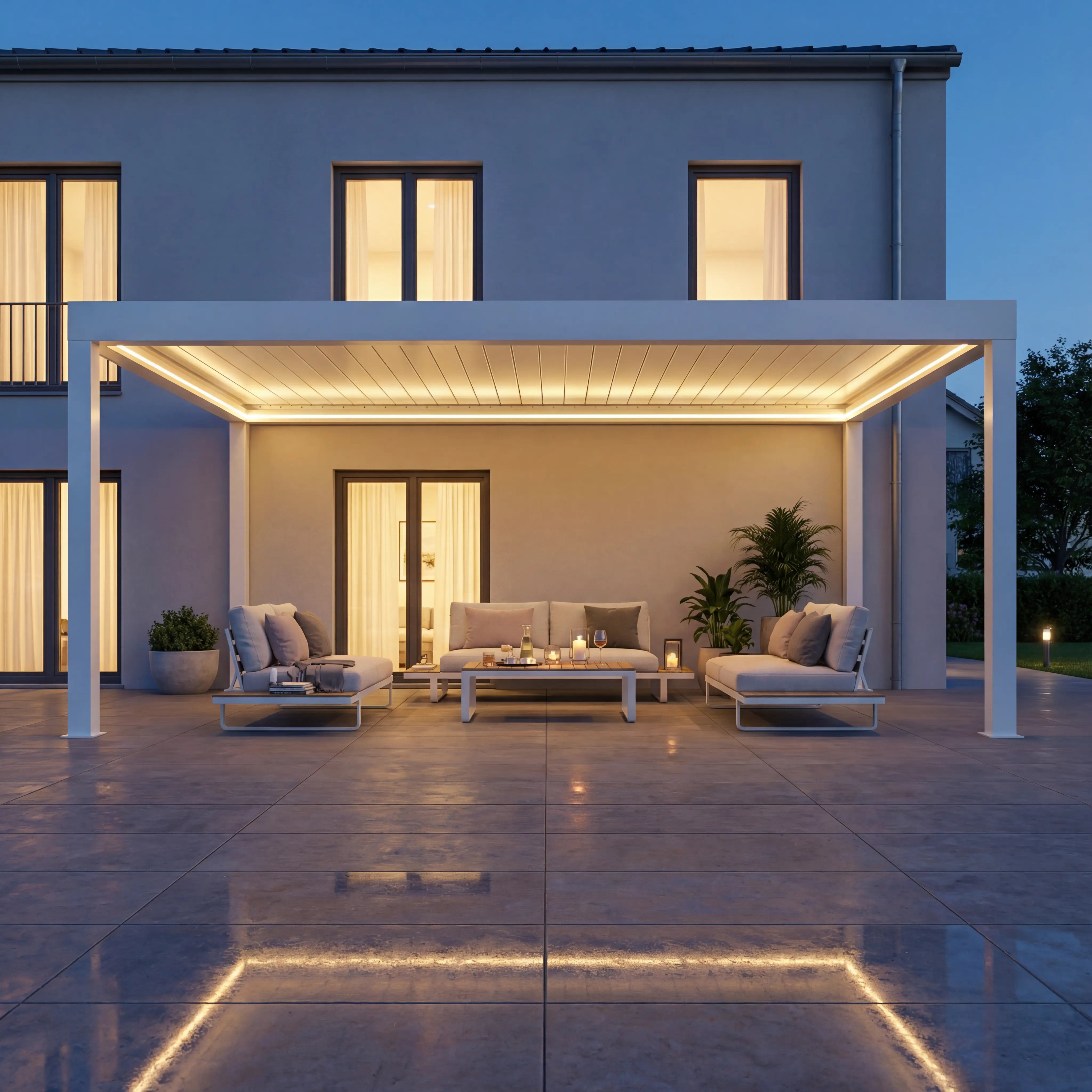 Unsere Pergola ist mit einer eleganten LED-Beleuchtung ausgestattet. Im Rahmen befindet sich eine dimmbare warmweiße LED-Lichtleiste, die eine stilvolle und angenehme Atmosphäre schafft. Die Beleuchtung ist wetterfest, energieeffizient und kann bequem per App, Sprachsteuerung oder Fernbedienung gesteuert werden.