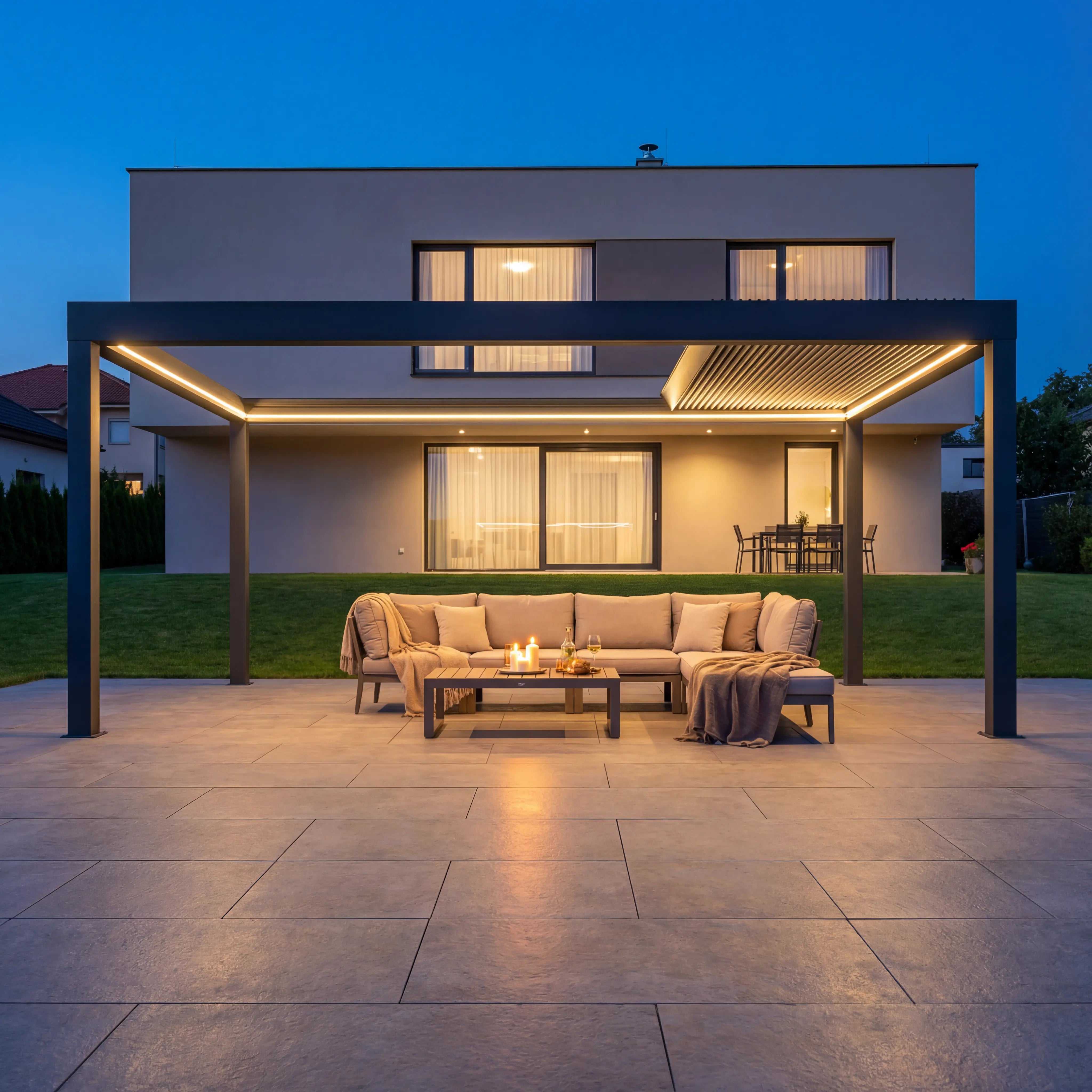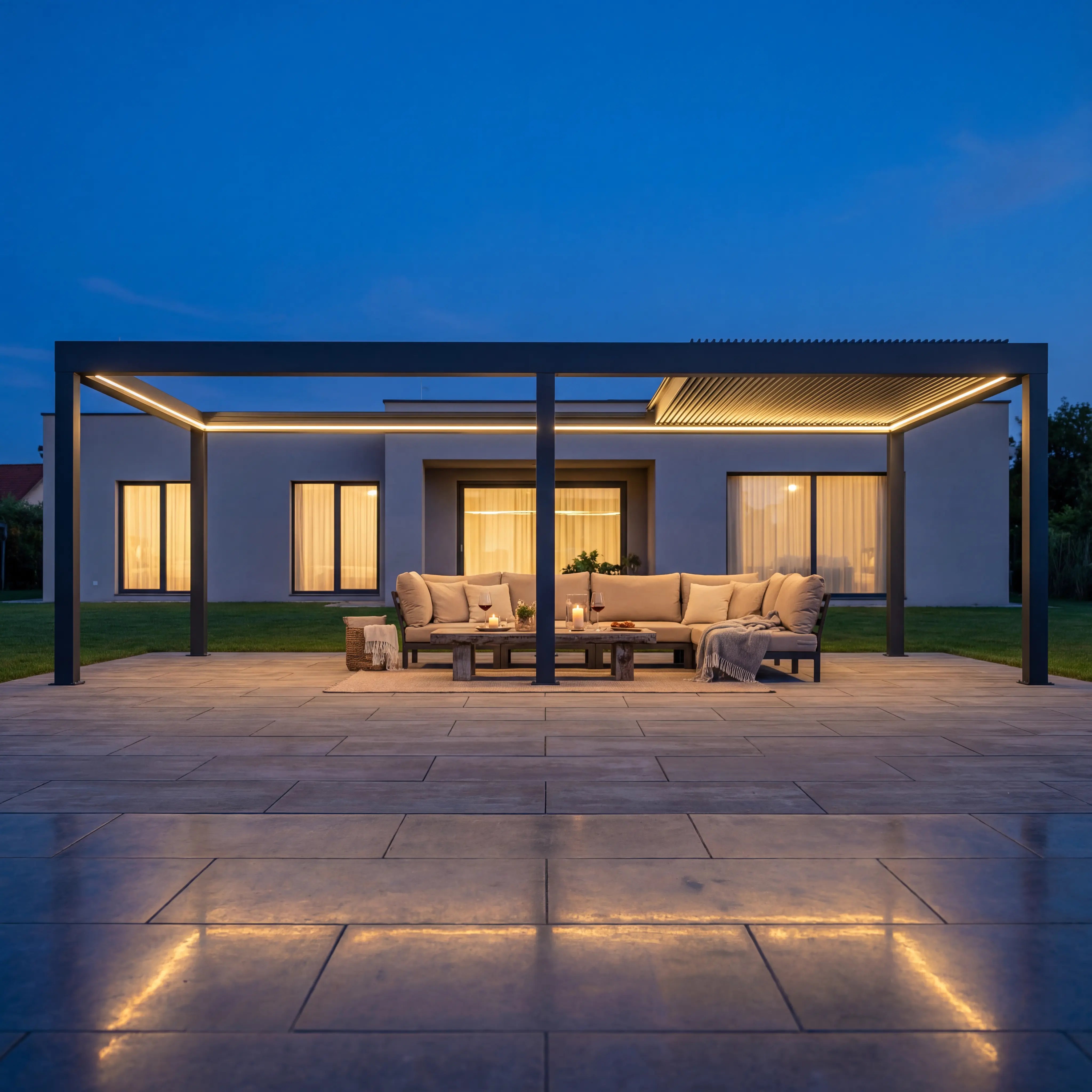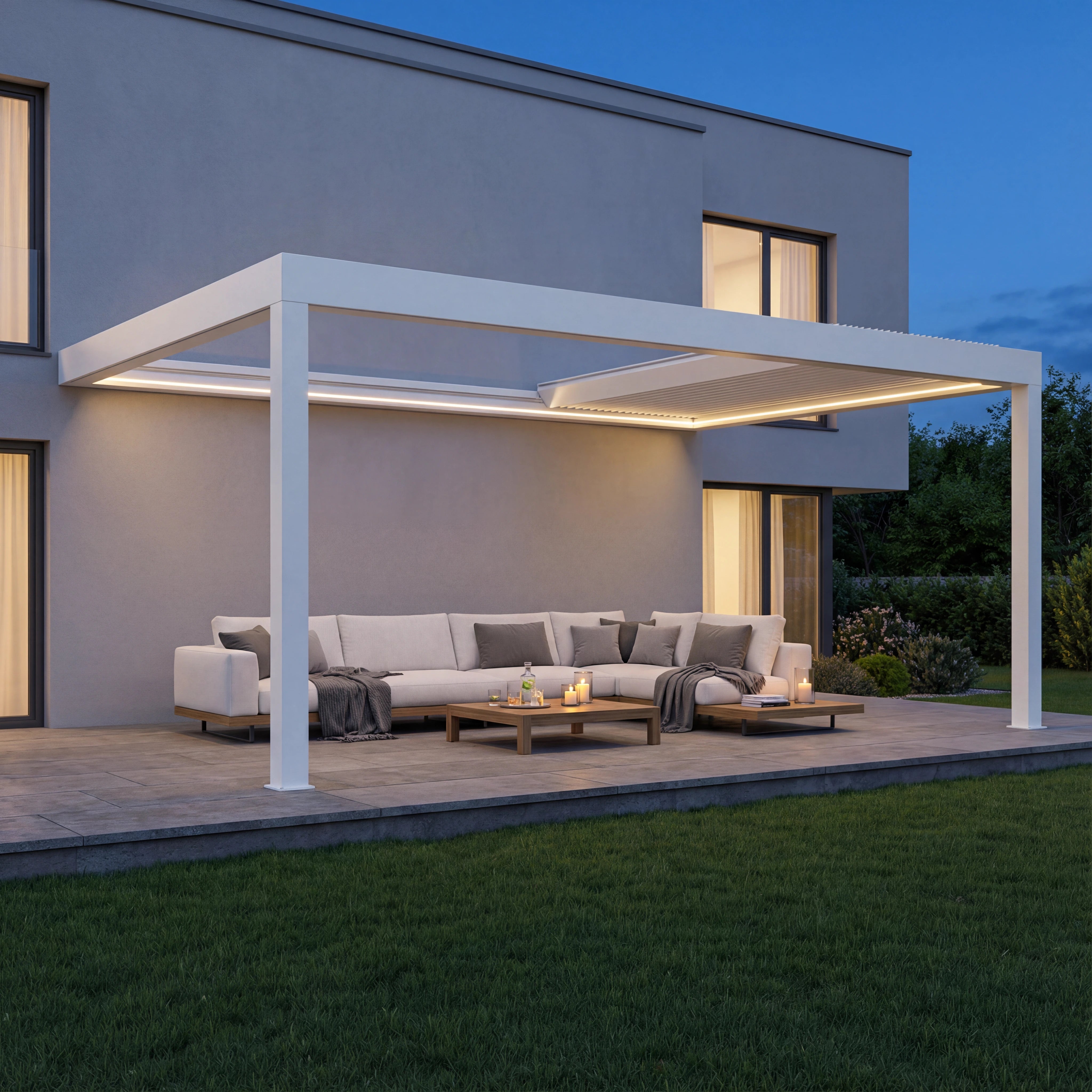 Die SkyInfinity Pro Pergola vereint modernste Technologie mit luxuriösem Design. Ihr motorisiertes, bis zu 75 % aufschiebbares Lamellendach und die integrierte, dimmbare LED-Beleuchtung im Rahmen schaffen ein einzigartiges Outdoor-Erlebnis – offen, flexibel und gleichzeitig wettergeschützt.