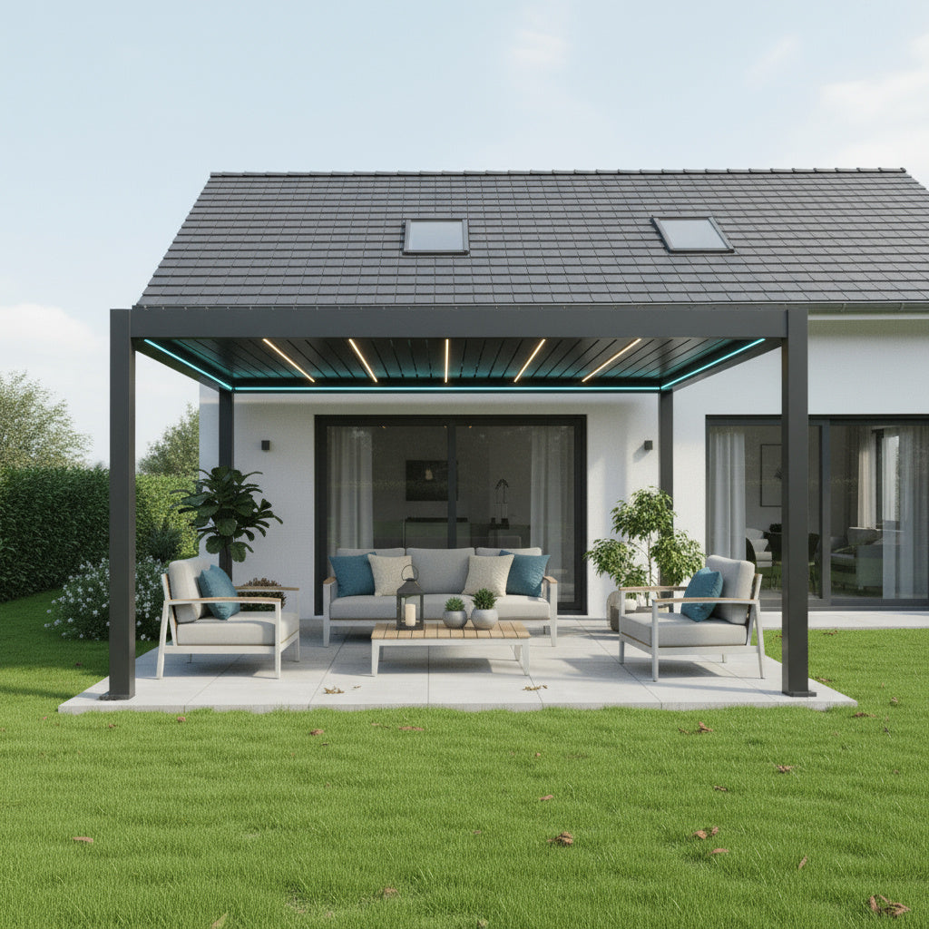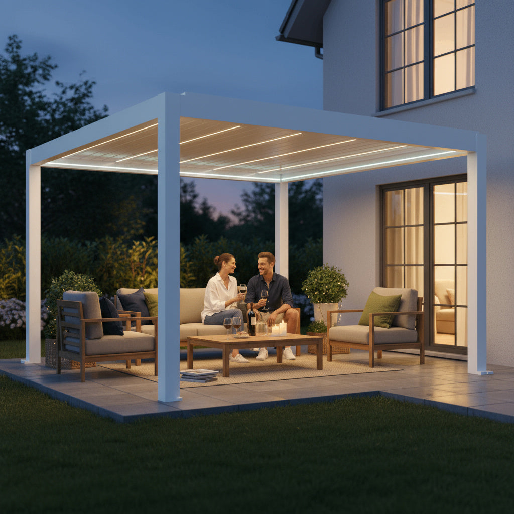 Die SkyMax Ultra Pergola vereint modernste Technologie mit elegantem Design. Dank motorisiertem Lamellendach und integrierter LED-Beleuchtung sorgt sie für ein einzigartiges Outdoor-Erlebnis – wetterunabhängig, stilvoll und funktional.