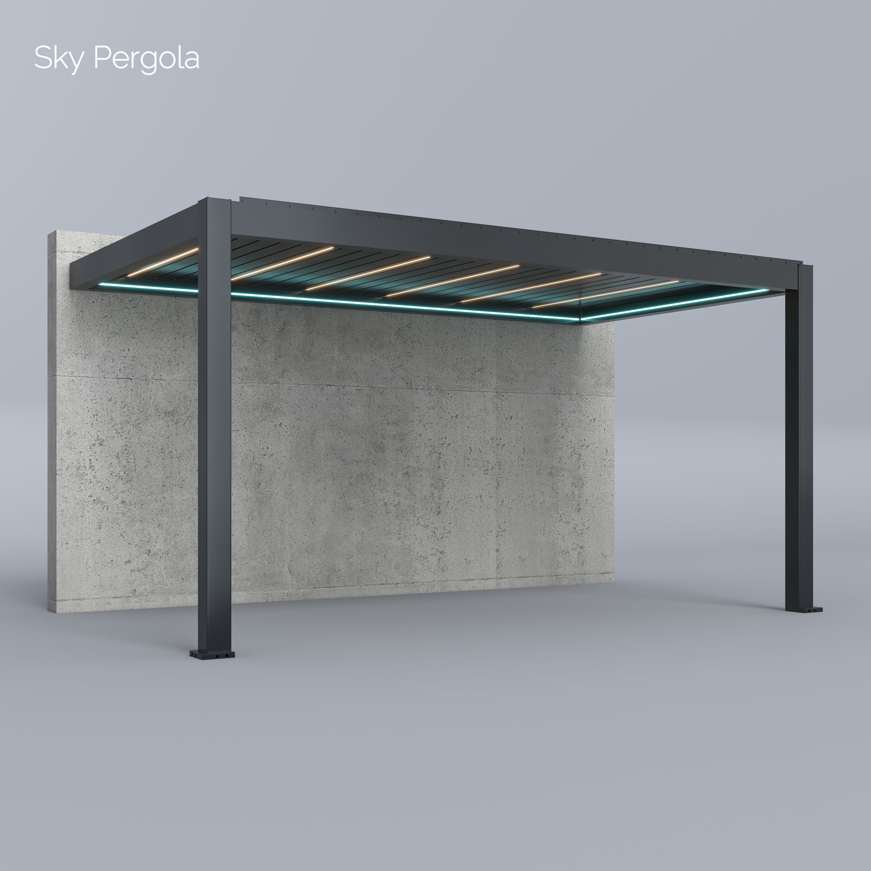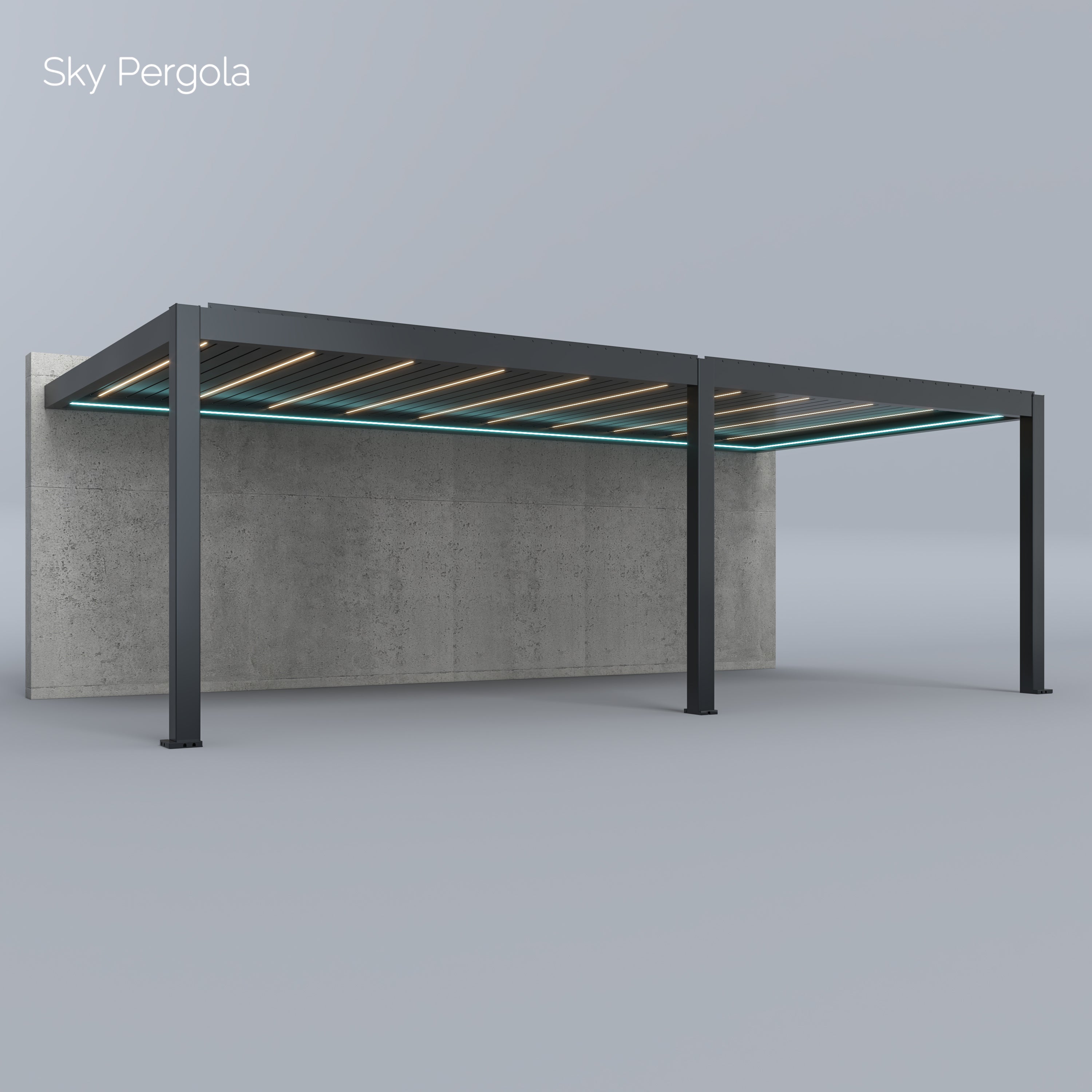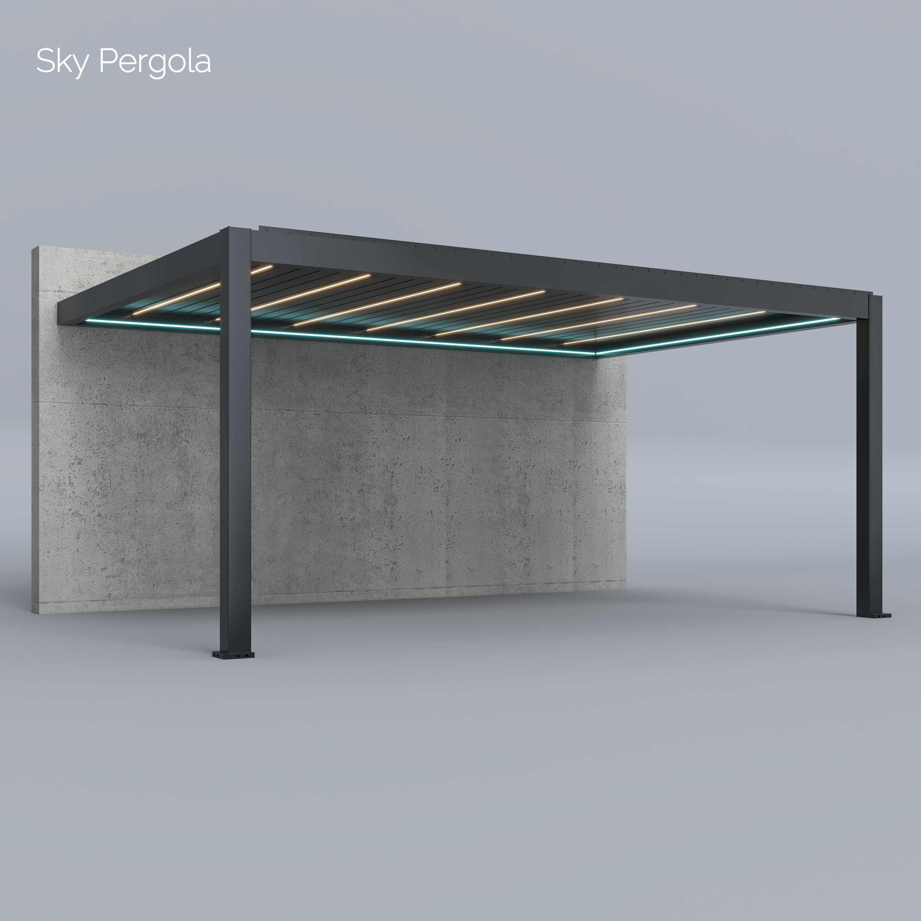 Unsere Sky Pergola Modelle bestehen aus rostfreiem, pulverbeschichtetem Aluminium. Dieses hochwertige Material ist absolut wetterfest und benötigt kaum Wartung. Im Gegensatz zu Stahl- oder Holzkonstruktionen kann das Material weder rosten noch verwittern. Die Pergola ist auf eine langlebige Nutzung von über 30 Jahren ausgelegt.