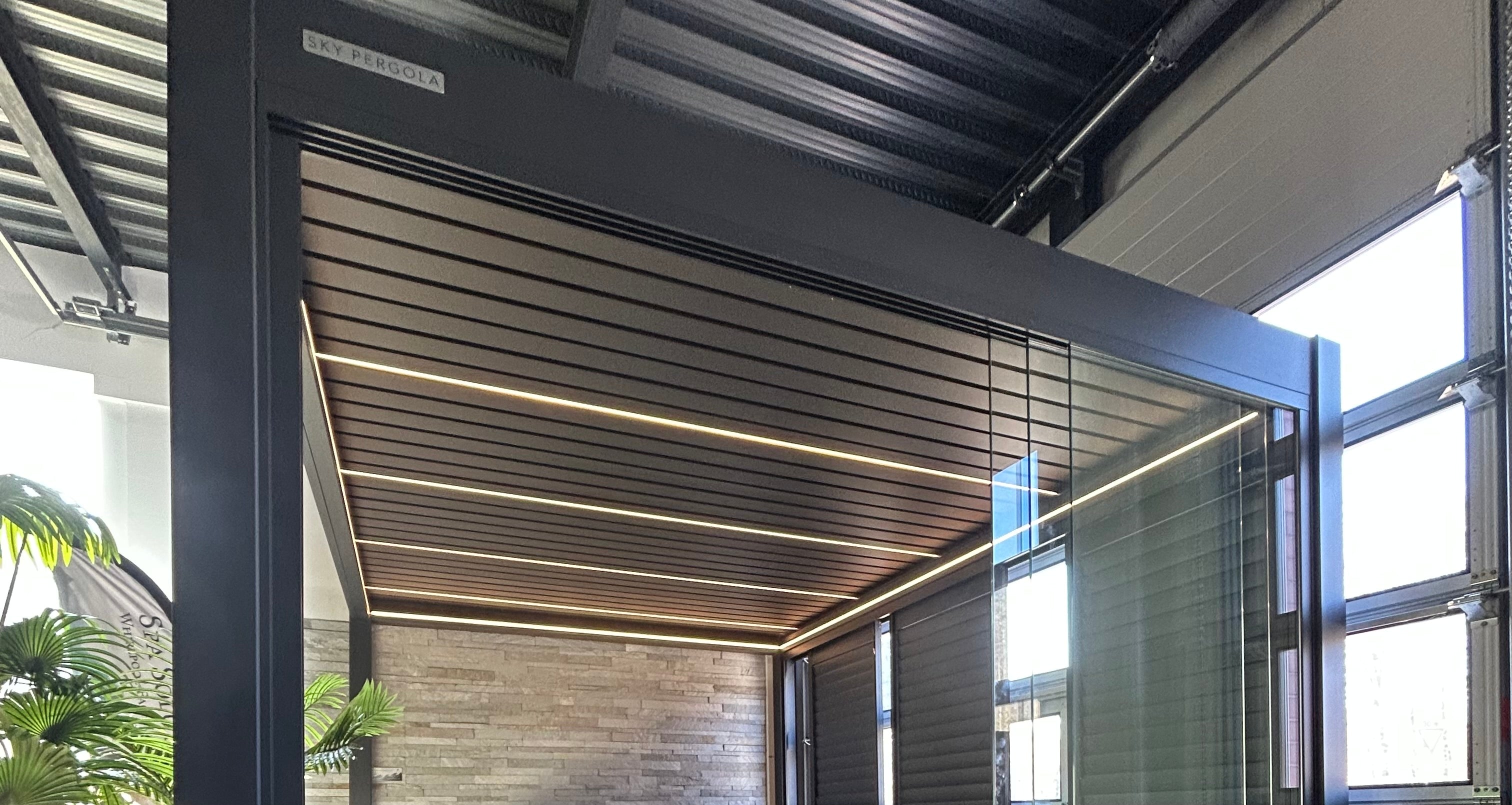 The SkyMotion LED Pergola combines Swiss quality with sophisticated technology – for lasting stability and elegance in any weather.
