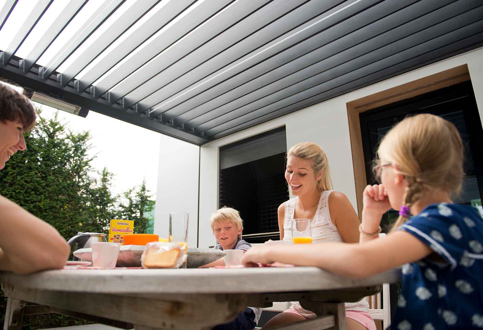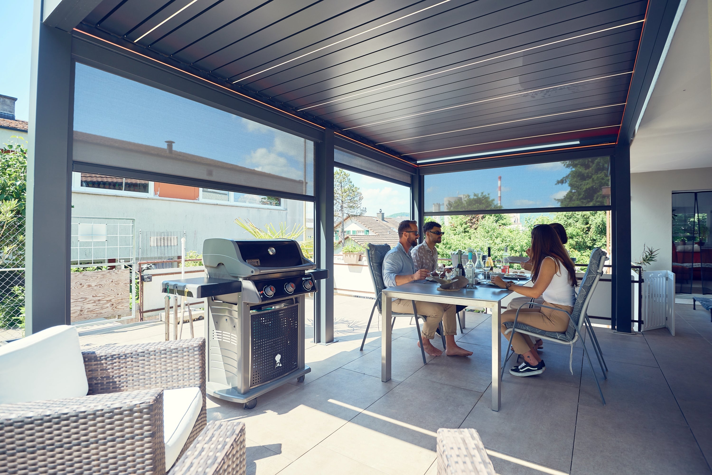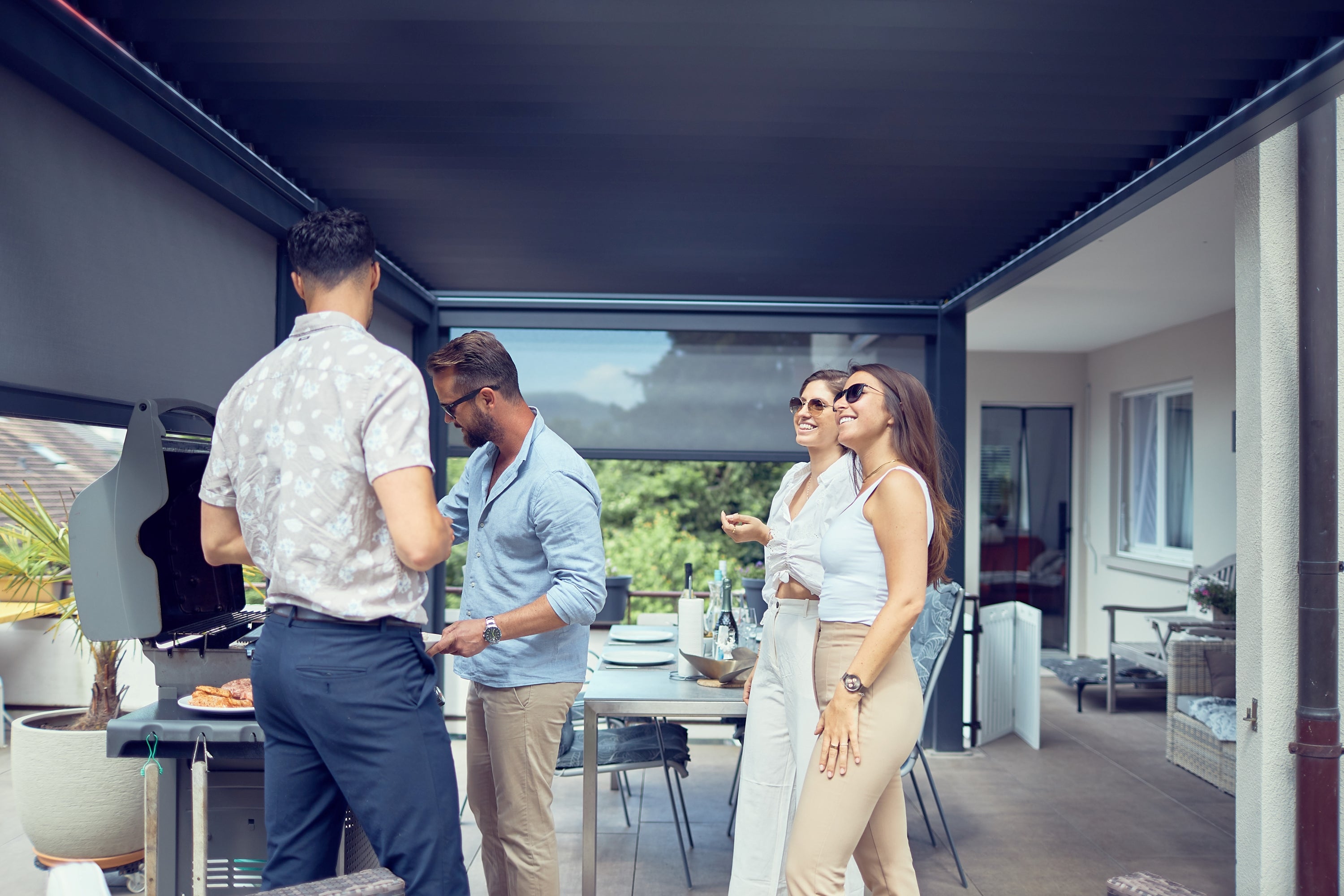 Avec les stores latéraux, les parois à lamelles ou les parois vitrées Sky Pergola, les côtés peuvent être fermés de manière flexible et le vent peut être réduit efficacement – ​​pour encore plus de confort par tous les temps.