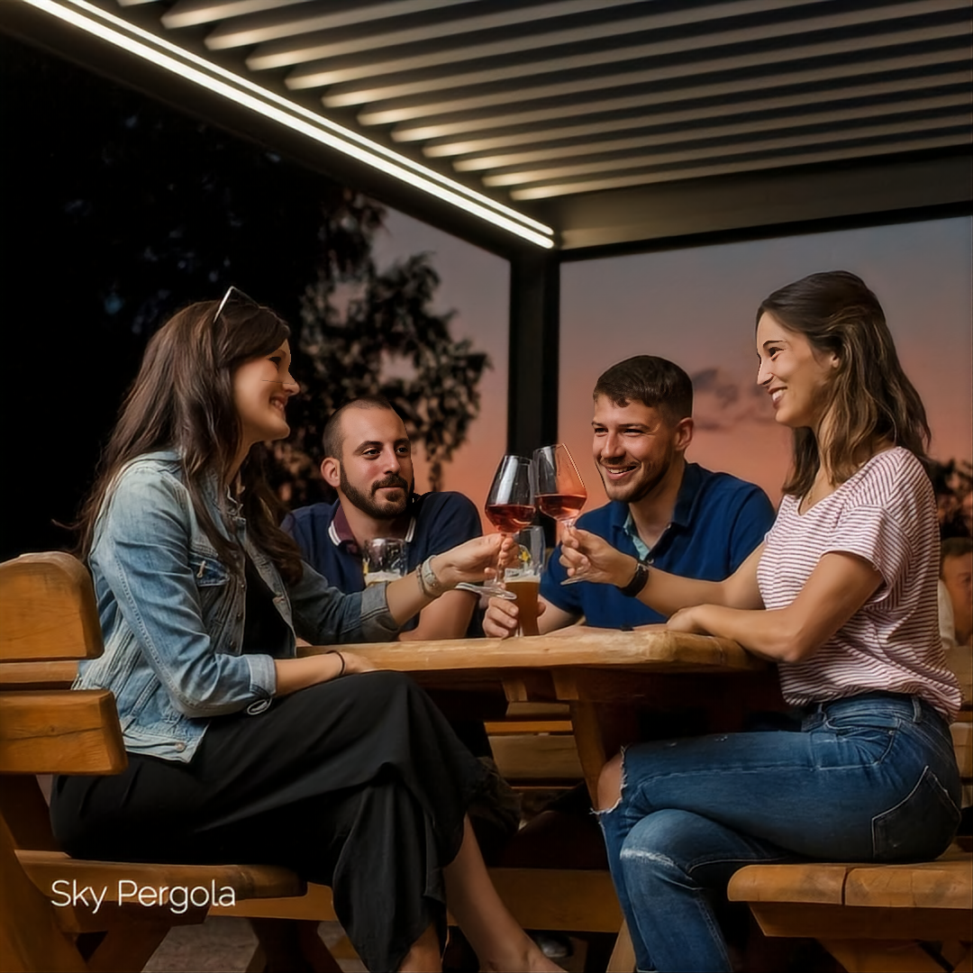 Nos modèles Sky Pergola sont fabriqués en aluminium thermolaqué antirouille. Ce matériau de haute qualité est totalement résistant aux intempéries et nécessite un entretien minimal. Contrairement aux structures en acier ou en bois, il ne rouille pas et ne subit pas les intempéries. La pergola est conçue pour une durée de vie de plus de 30 ans.