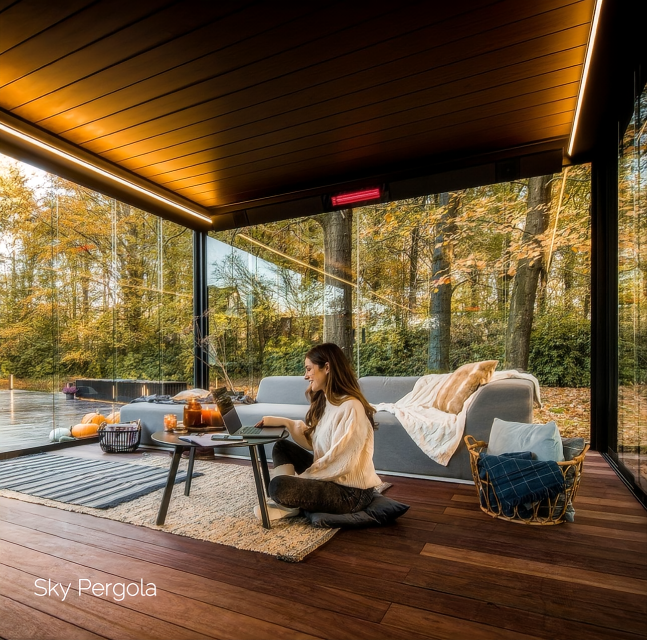Vous pouvez ajouter divers accessoires pratiques à votre Sky Pergola pour améliorer encore son confort et sa fonctionnalité. Parmi ceux-ci, des parois à lames fixes ou mobiles pour une intimité latérale et une protection contre le vent, d'élégantes parois vitrées pour une protection transparente contre les intempéries, et des stores latéraux manuels ou motorisés. Des chauffages infrarouges peuvent être installés pour maintenir une température agréable même par temps frais, tandis que des ventilateurs assurent une meilleure circulation de l'air lors des chaudes journées d'été. Un capteur de pluie peut également être intégré, fermant automatiquement les lames en cas de pluie. Votre Sky Pergola se transforme ainsi en un véritable havre de paix extérieur toute l'année.