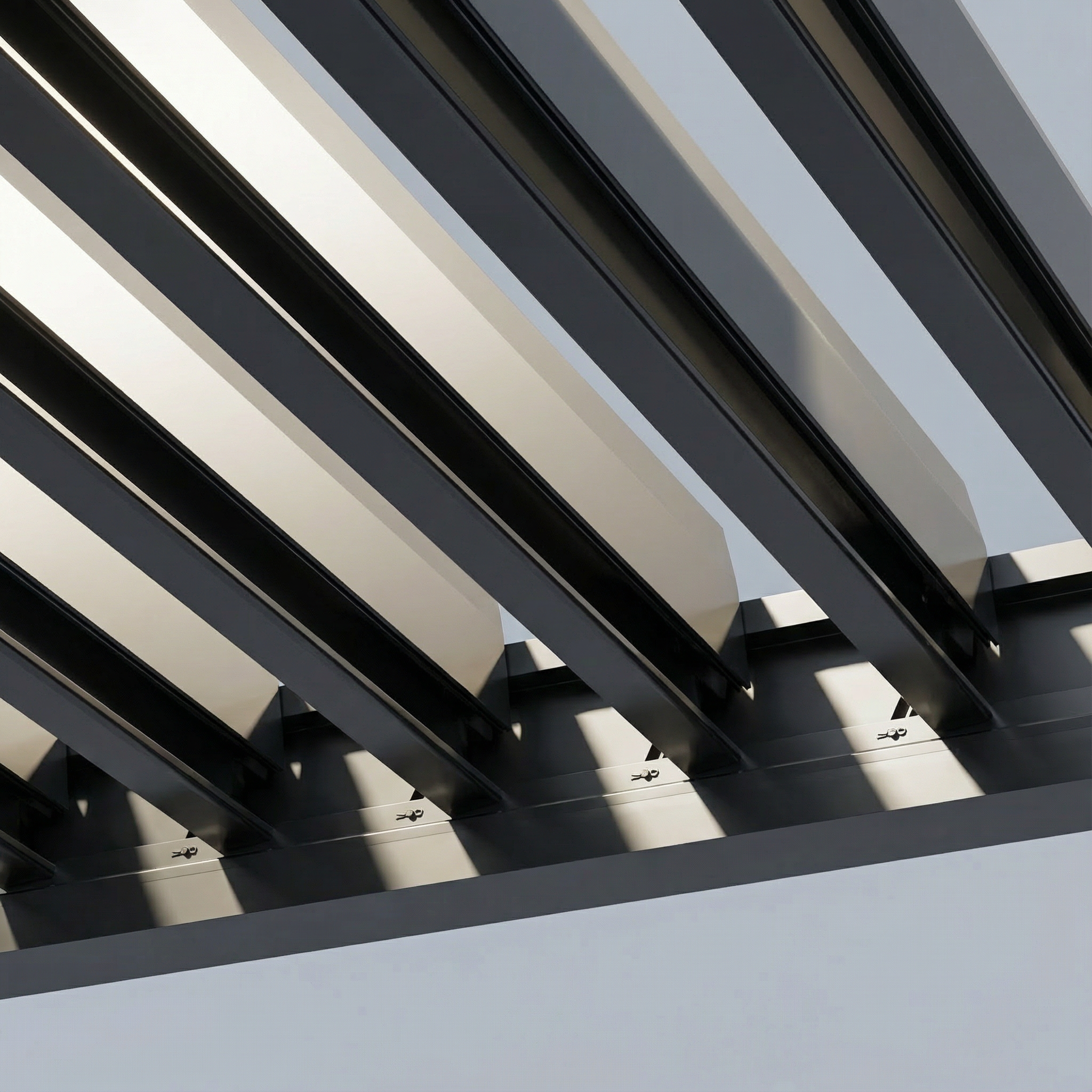 Effizientes EntwässerungssystemTrotz manuellem Dach verfügt die SkyLite ECO über ein effektives Wasserableitungssystem. Regen wird durch die geneigten Lamellen kontrolliert in die seitlichen Rinnen und weiter durch die Pfosten abgeleitet – ganz ohne sichtbare Tropfspuren.