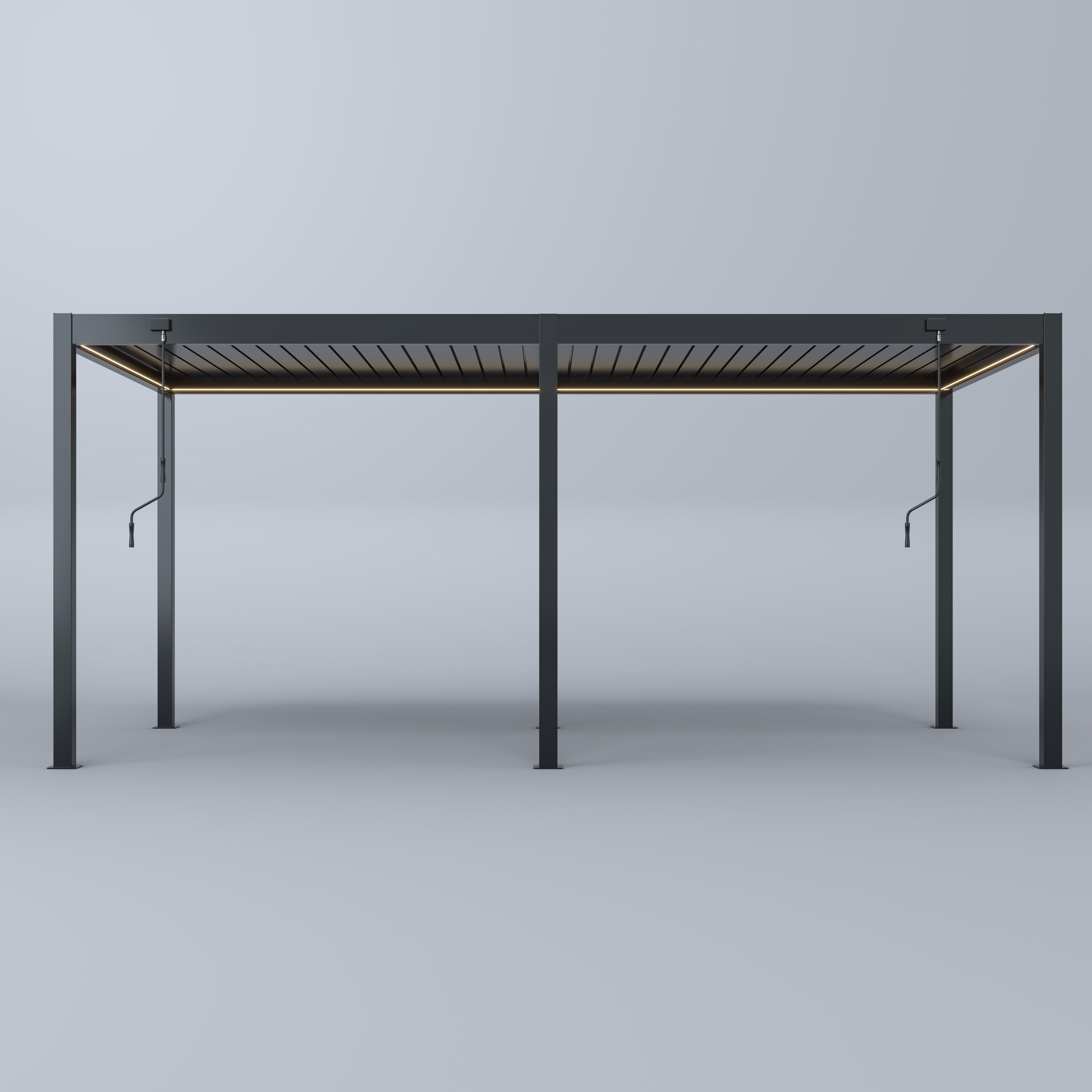 Das Lamellendach wird manuell über eine Handkurbel geöffnet und geschlossen.Die integrierte LED-Beleuchtung lässt sich bequem über die SkyPergola-Fernbedienung steuern.