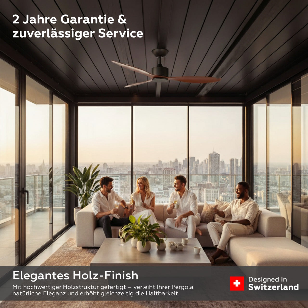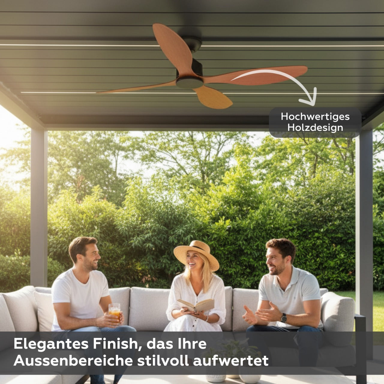 Hochwertiges Holzdesign: Der Ventilator ist aus edlem, hochwertigem Holz gefertigt, das nicht nur für Langlebigkeit sorgt, sondern auch optisch ein Highlight darstellt. Er fügt sich nahtlos in das Design Ihrer Pergola ein und verleiht ihr eine elegante Note.